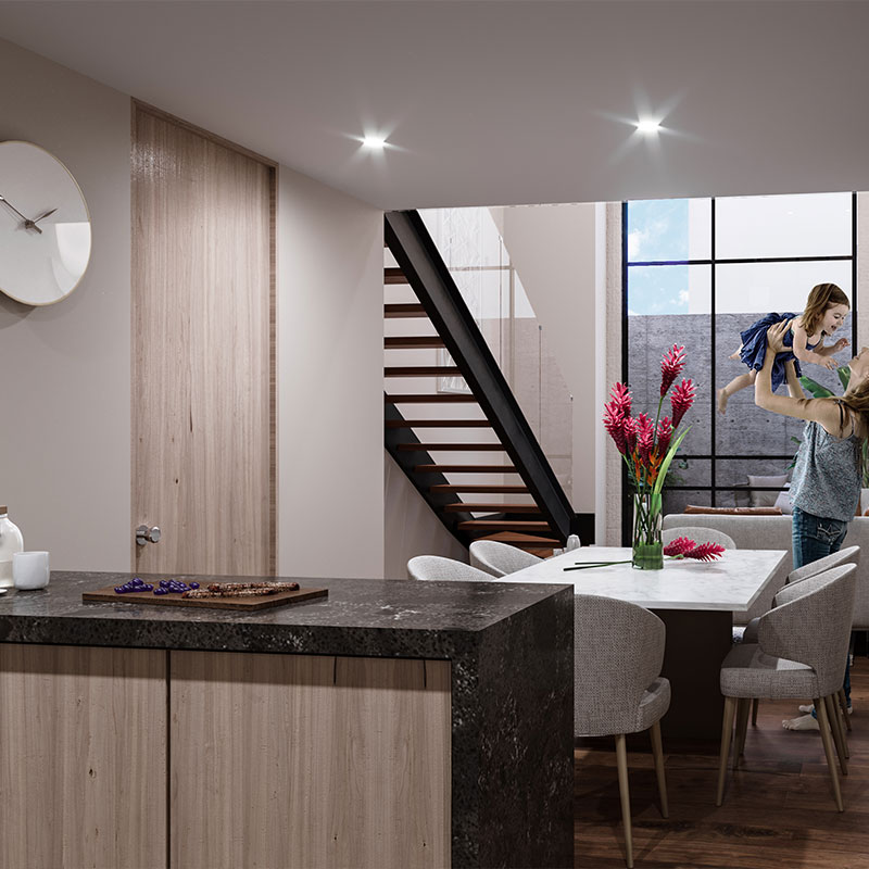 Cada residencia ofrece cocina, estancia y comedor integrados, un family room en tapanco, dos recámaras secundarias con baño completo y una Master Suite con walk-in closet y baño.