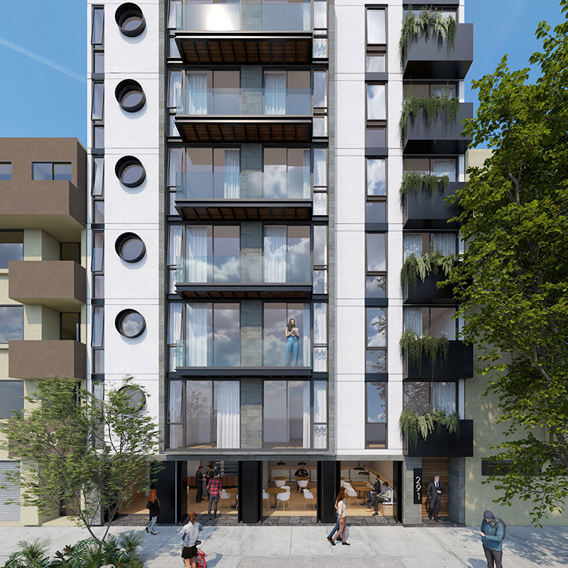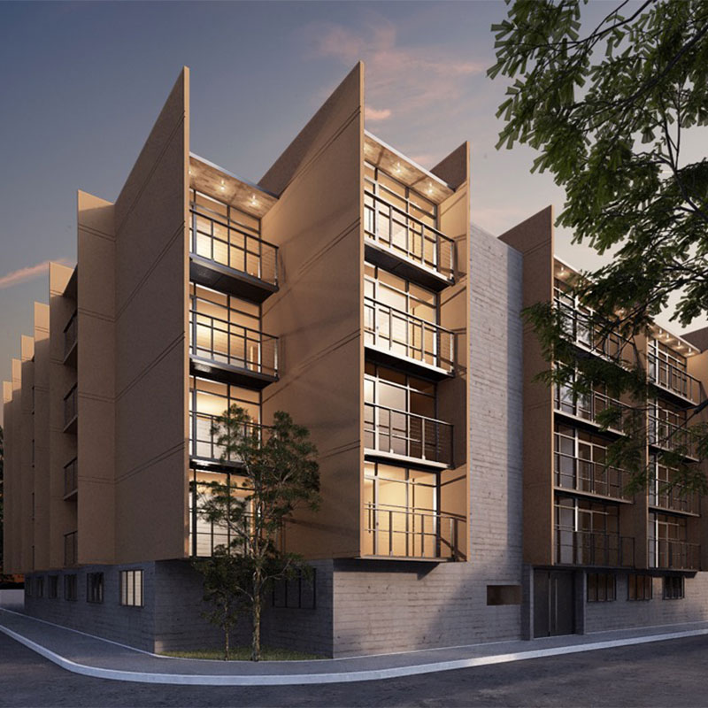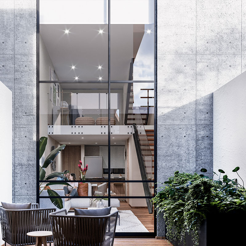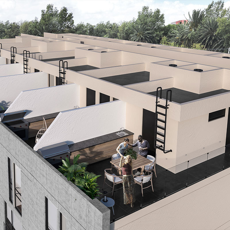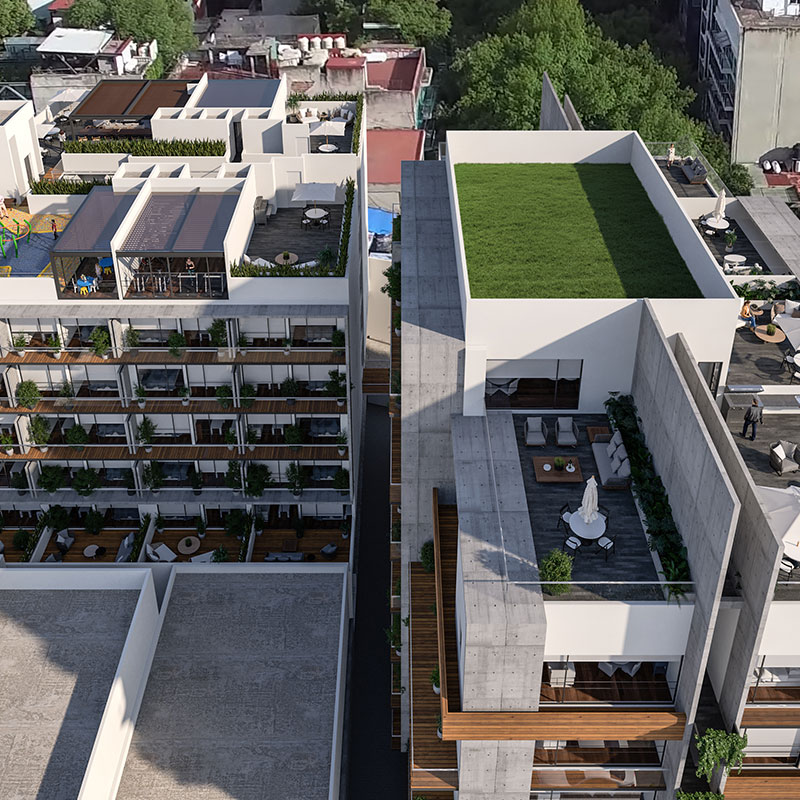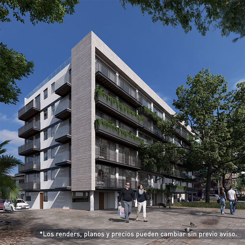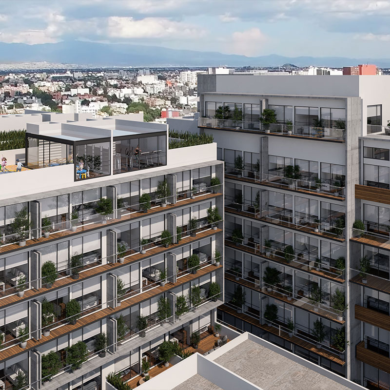 El desarrollo cuenta con 21 departamentos tipo loft de 43 a 60 m², todos con balcón o terraza, áreas comunes, roof garden, estacionamiento y seguridad 24 horas.