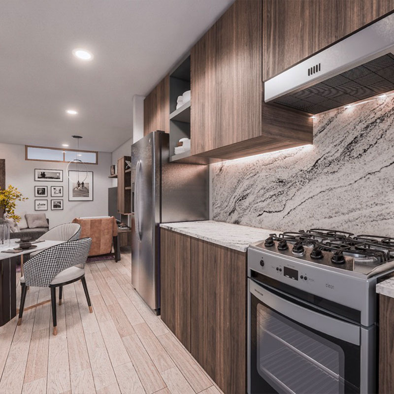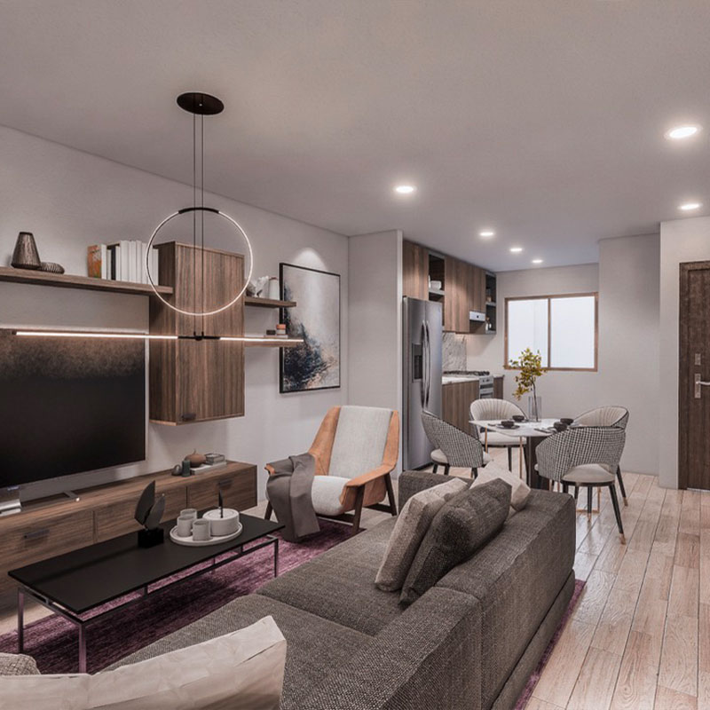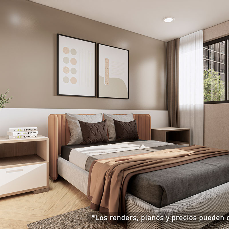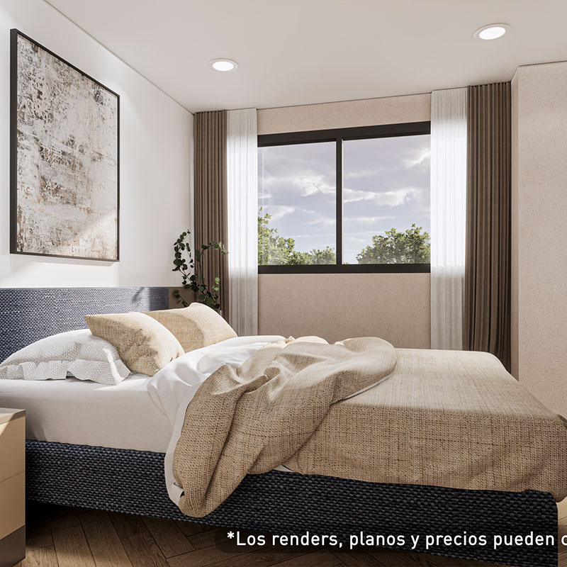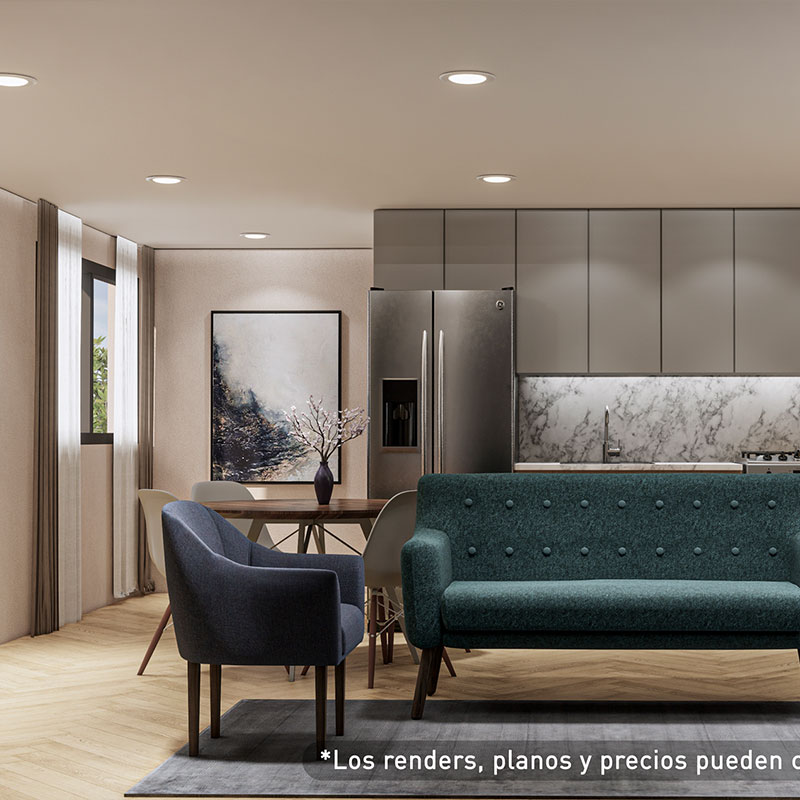 Los departamentos van de 59 m² a 65 m², con acabados modernos y espacios funcionales diseñados para ofrecer comodidad y calidad de vida en un entorno familiar y bien conectado.