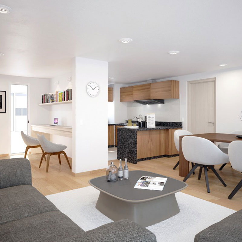 Ofrece unidades desde 42.79 m² hasta 103 m², con diseños funcionales, acabados modernos y espacios bien distribuidos que brindan confort y estilo de vida urbano.